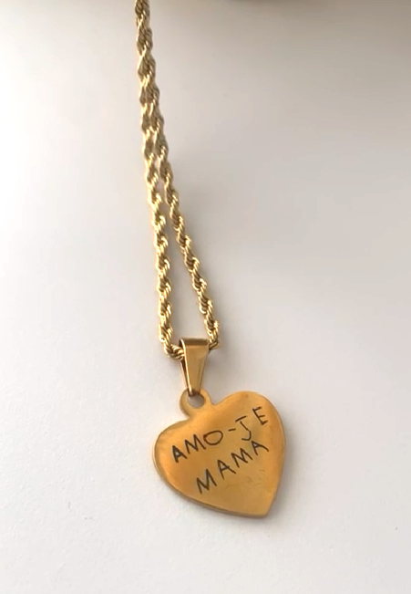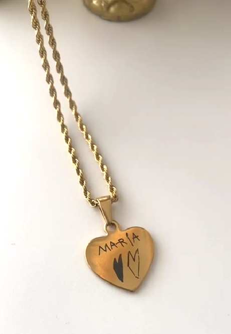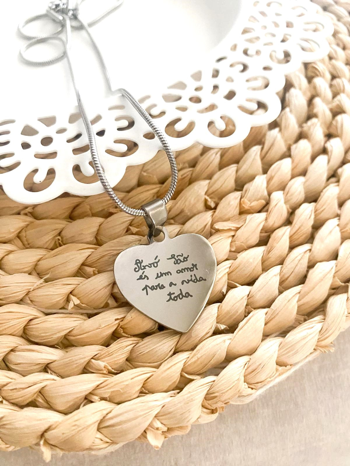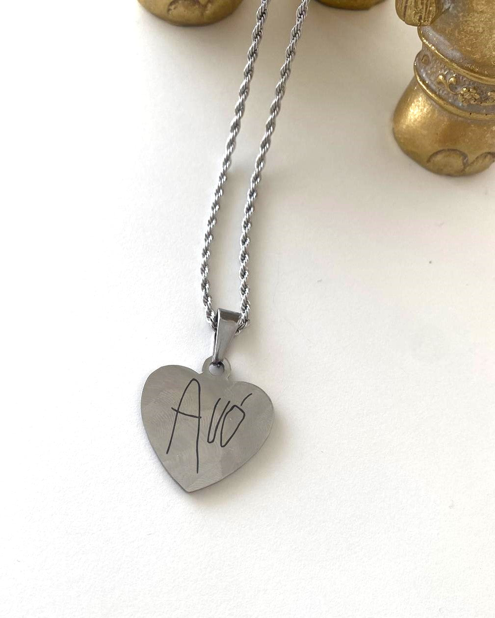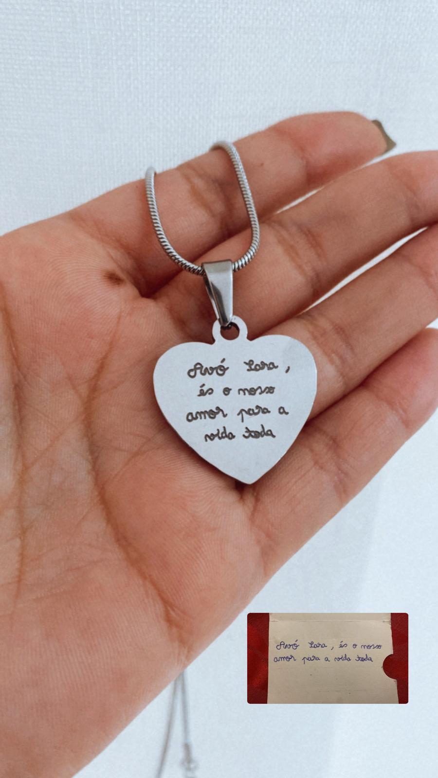 Colar em forma de coração. O colar ideal para gravar a assinatura de alguém importante ou um texto escrito à mão, de forma a eternizar para todo o sempre.